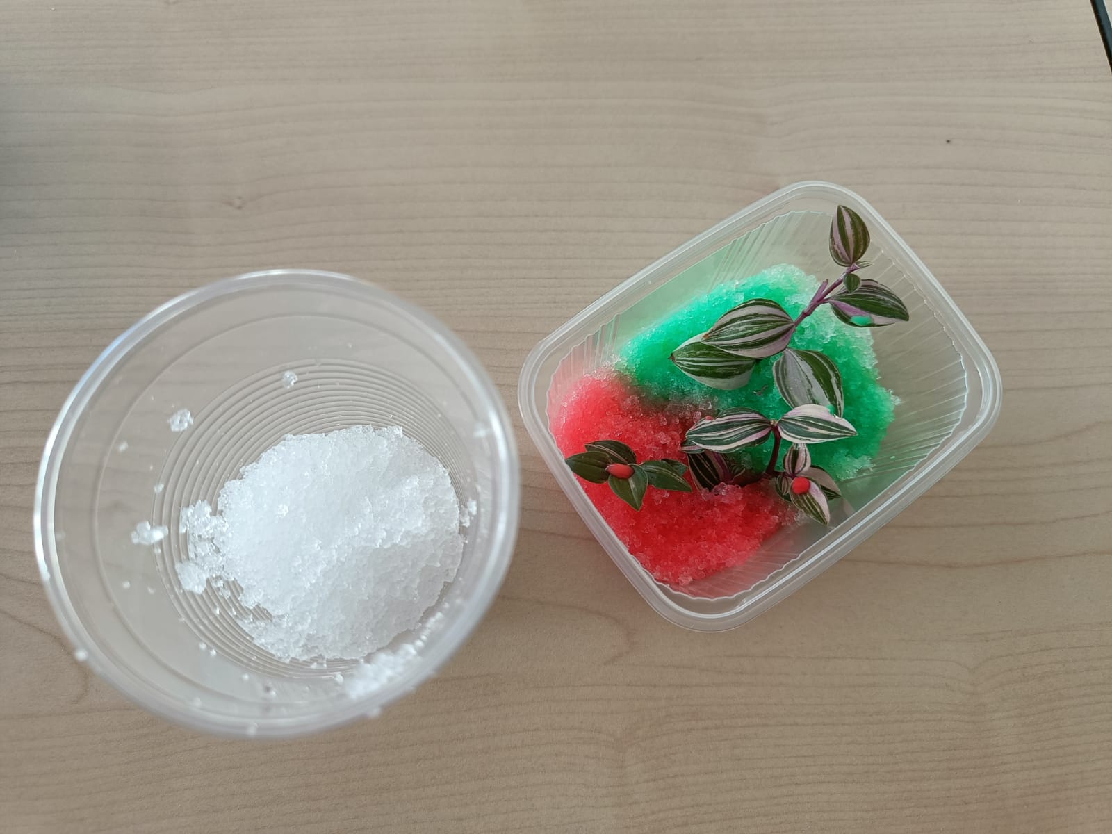 Nachdem wir Alaun in warmen Wasser aufgelöst haben, kamen einige tropfen buntes Wasser hinzu. Nach minutenlangem Rühren war der Ansatz für unsere Kristalle fertig. Über Nacht mussten wir dieses Gemisch stehen lassen und warten.