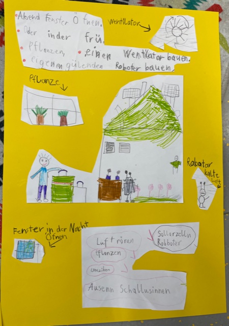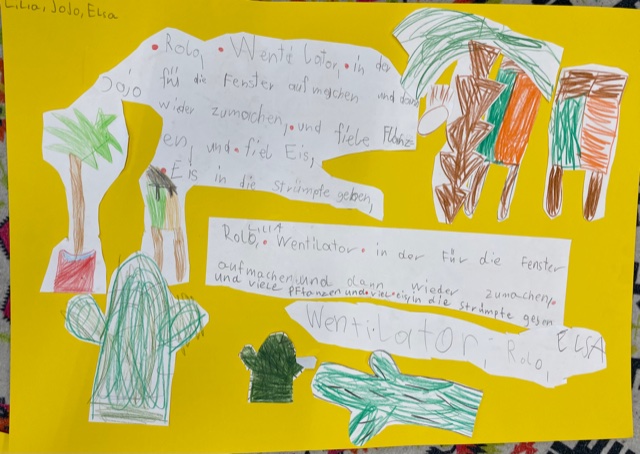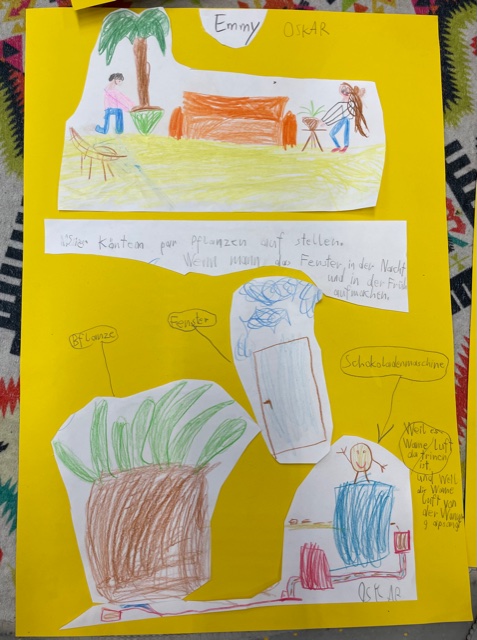 Die Mädchen der 2b waren sehr kreativ und hatten wirklich tolle Idee, um die heiße Dachgeschoss einer Mädels WG zu kühlen…es ging von Anbringen von Aussenrollos, über viele Pflanzen aufstellen, feuchte Wäsche aufhängen bis hin zu viel Eis in die Strümpfe stecken :-). Die Mädels kamen aber auch auf die Idee eine Schokoladenmaschine auf der Terrasse aufzustellen, die mit der Wärme aus der Wohnung betrieben wird. So wird es kühl in der Wohnung und außerdem produziert man ganz nebenbei noch leckere Schoki. Eine Gummibärlimaschine würde ebenfalls die warme Luft aus der Wohnung absaugen und zum Antrieb nutzen. Last but not least könnte man einen durch Solarzellen betriebenen pinkglitzernden Ventilator-Roboter aufstellen, der würde das Sonnenlicht von der Dachterrasse nutzen und gleichzeitig die Wohnung angenehm runterkühlen. Viele witzige Zukunftsvisionen, aber wer weiß, vielleicht wird es diese coolen Maschinen ja doch irgendwann geben?