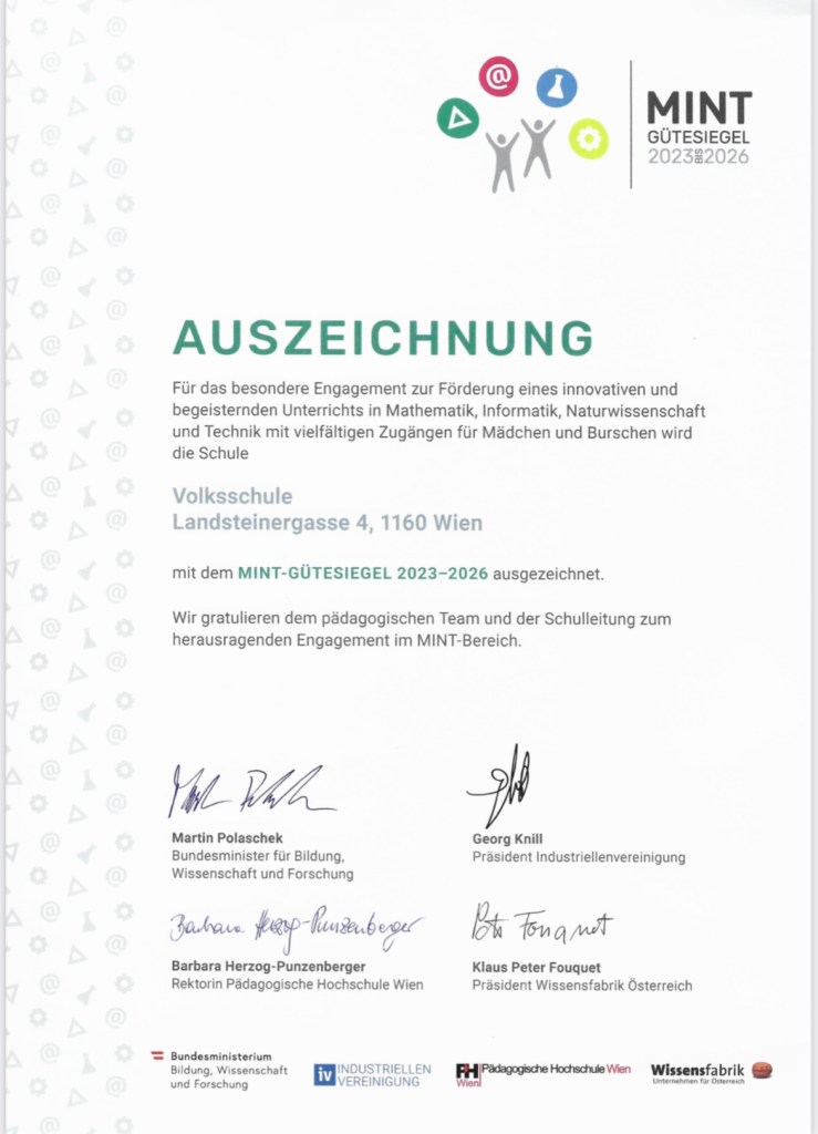 Bildungsminister Martin Polaschek, der Präsident der Industriellenvereinigung Georg Knill, der Vizerektor der Pädagogischen Hochschule Wien Norbert Kraker und der Präsident der Wissensfabrik Österreich Klaus Peter Fouquet verliehen am Dienstag 6.6.2023 das „MINT-Gütesiegel 2023-2026“ an 130 neue innovative Bildungseinrichtungen aus ganz Österreich. Auch die Hans-Christian-Andersen Volksschule war unter den stolzen PreisträgerInnen. Das gesamte Team der OVS Landsteinergasse leistete großartige Arbeit und beschäftigte sich in diesem Schuljahr intensiv mit dem Thema MINT. Die Kinder waren mit Begeisterung dabei und freuten sich über viele spannende Experiment, coole Aktivitäten und interessante Unterrichtsstunden. Auf unserer MINT-Seite kann man sich davon überzeugen. https://vs-landsteinergasse.com/mint/